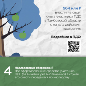 «Участие в Программе позволяет сформировать финансовую подушку безопасности и получить дополнительный доход к пенсии. Кроме того, в зависимости от размера доходов и той суммы, которая была внесена на счет ПДС, человек может получать ежегодный налоговый вычет до 52 тысяч рублей, если платил НДФЛ по ставке 13%, и до 60 тысяч рублей, если платил налог по ставке 15%», — прокомментировал управляющий тамбовским отделением Банка России Михаил Носенков.