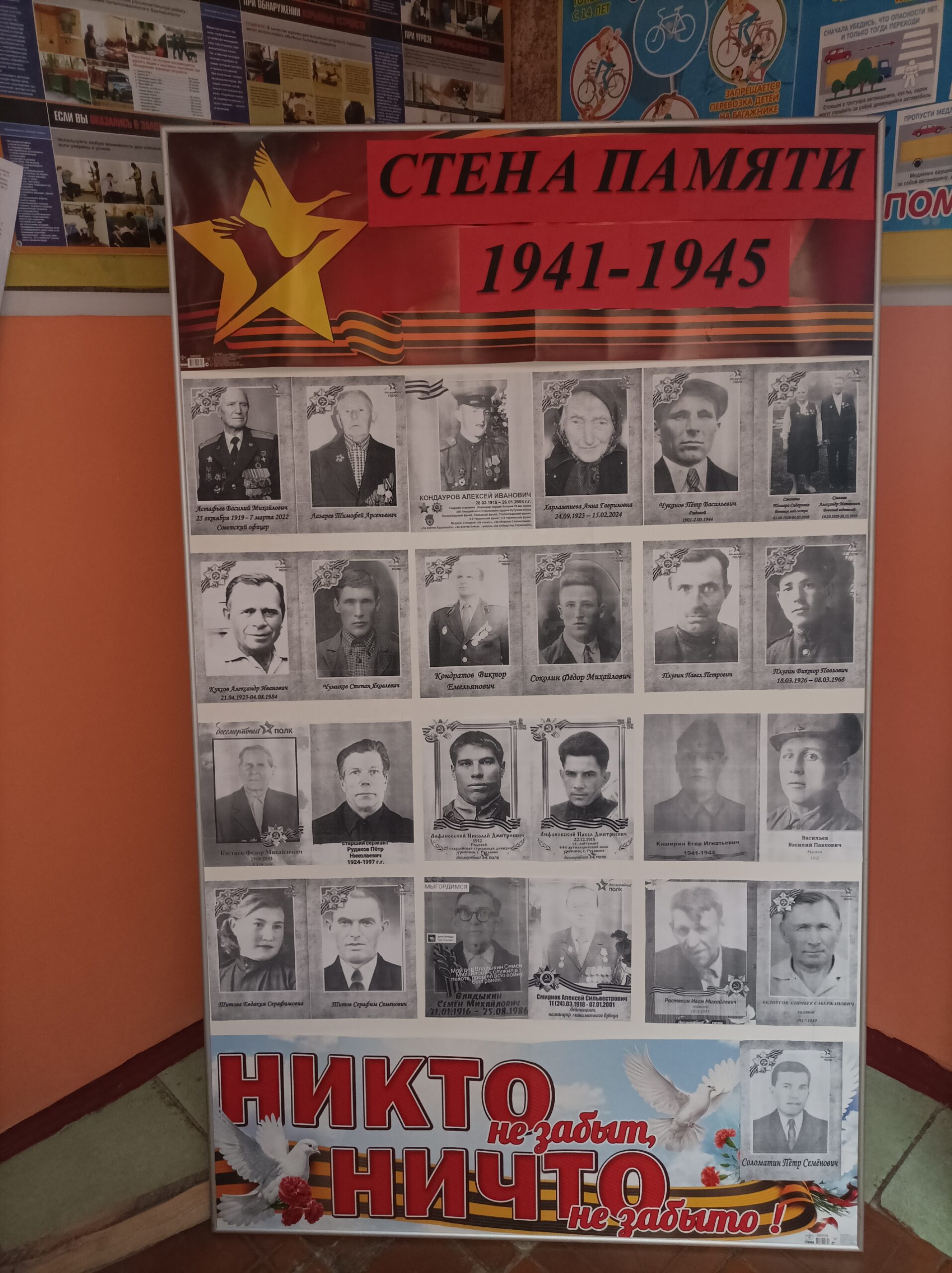 «Стена памяти» организуется на предприятиях, в учреждениях и школах. Там взрослые и дети размещают портреты своих родственников, участвовавших в Великой Отечественной войне.